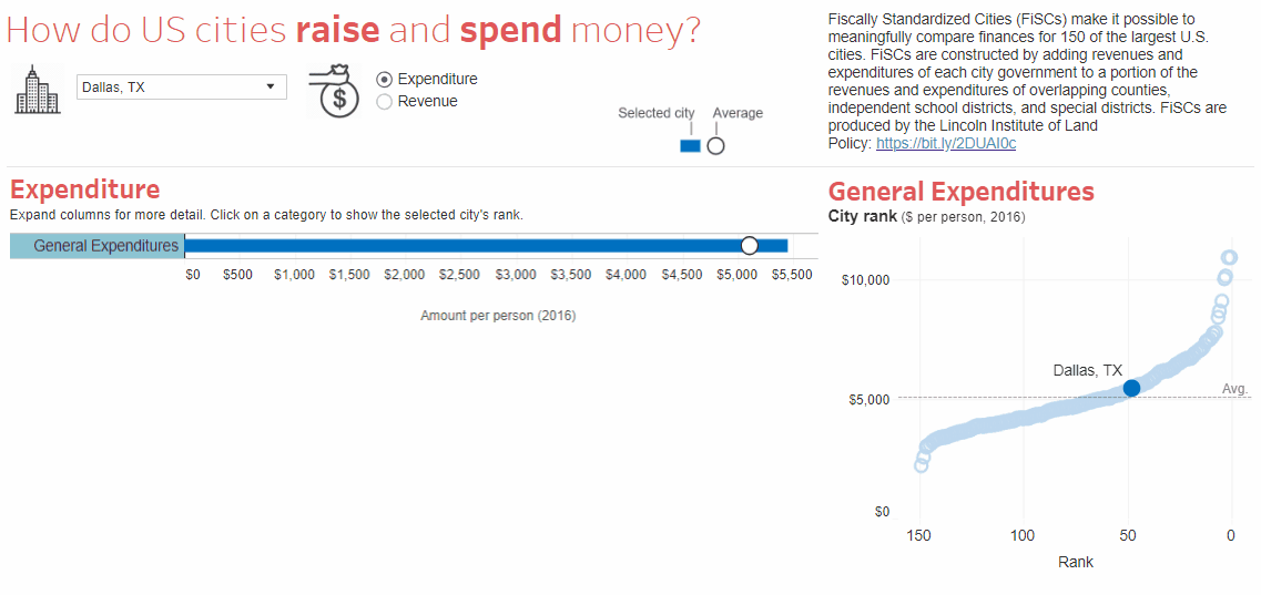 As an example, I created a dashboard showing how major cities in the US raise and spend money. The animation below demonstrates the main features of the dashboard, the full version of which can be found here.